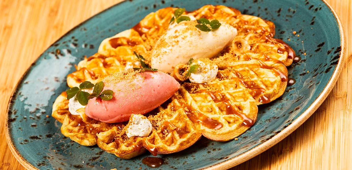 Nedenfor ser du hvordan du bygger en elegant vaffeldessert full av smak. Salt, søtt og godt!