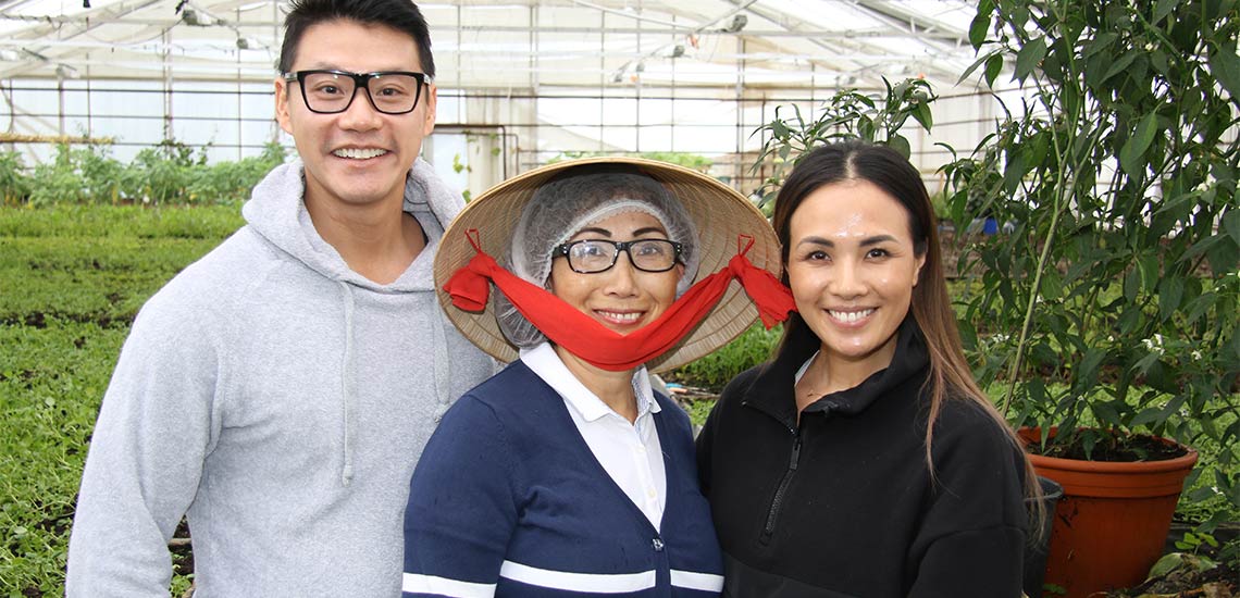 I et av drivhusene på gården står det tett i tett med urter og planter. Dette er Nghia Nguyen sitt domene.