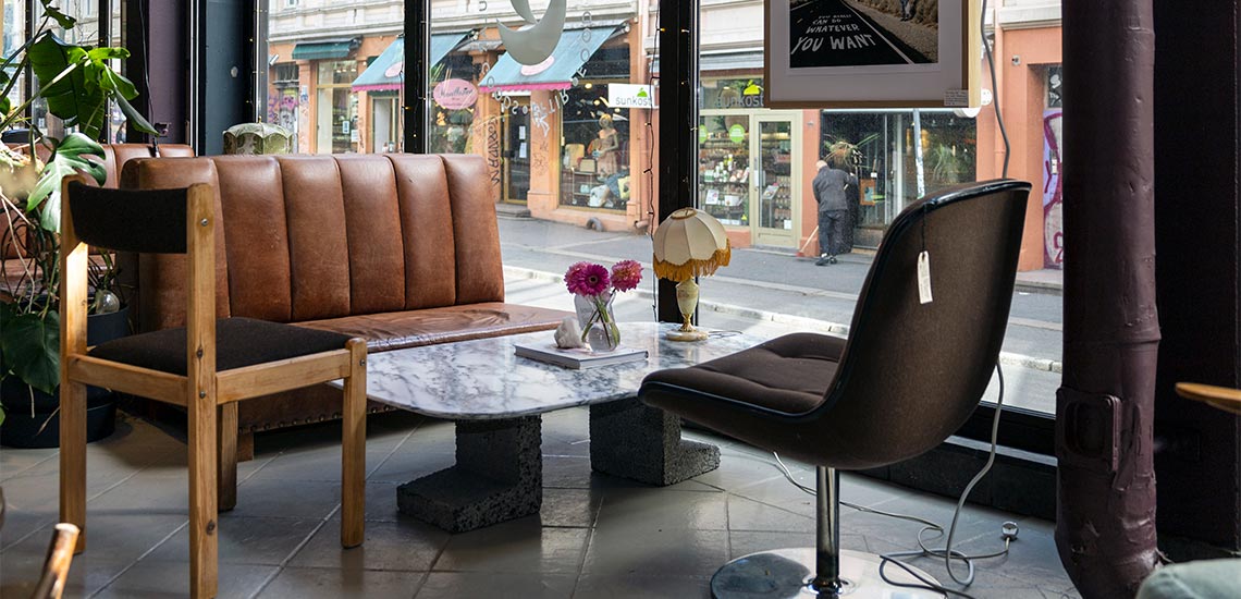 I Markveien på Grünerløkka finner vi mange nye og spennende serveringskonsepter. Et av disse er Eftir – en kombinert kafé og bruktbutikk. Visjonen er bærekraftig mat og ombruk av klær, kunst og interiør.