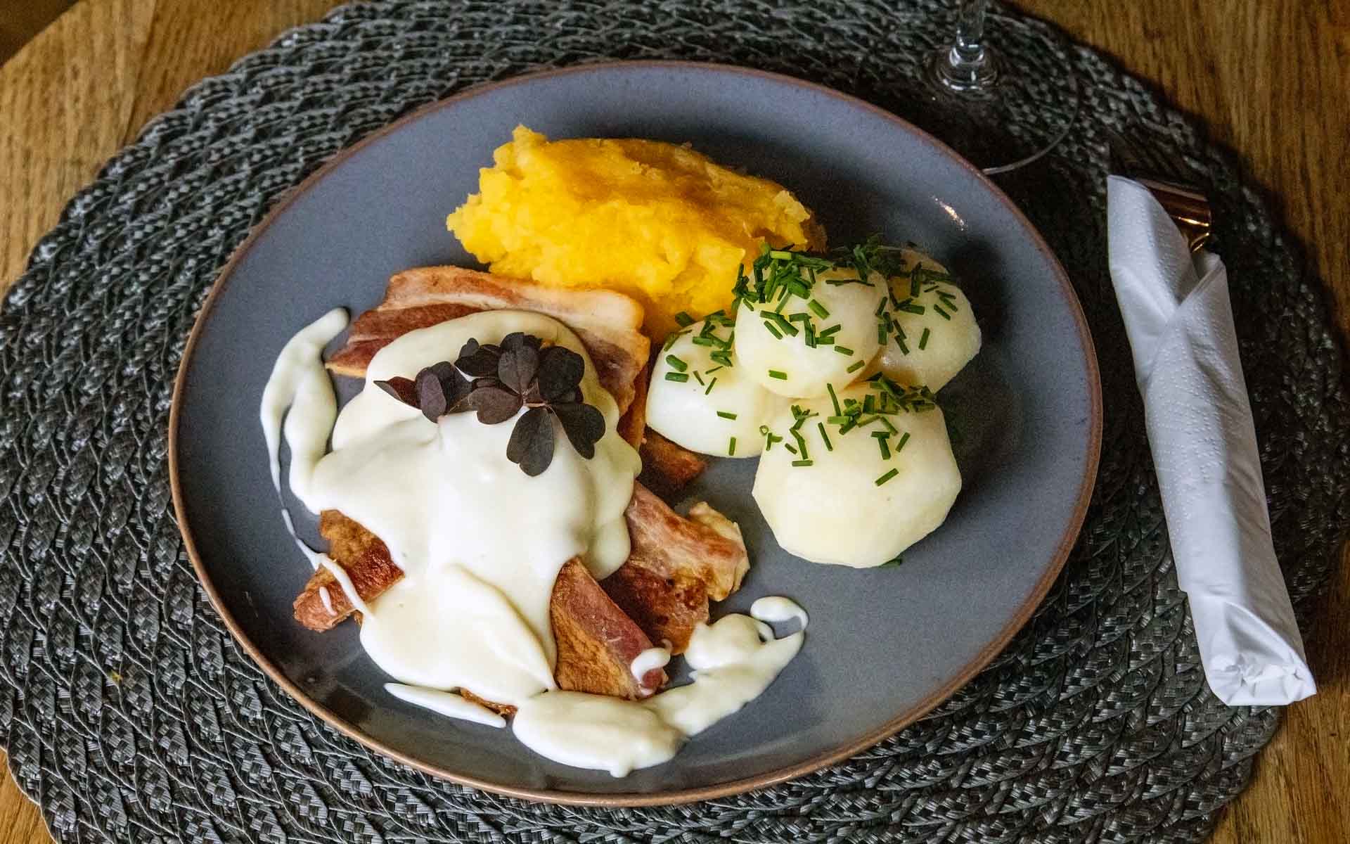 Selv om husmannskosten står i sentrum, finnes det også alternativer som burger og nachos, og kjøkkenet tilpasser seg gjerne vegetarønsker.