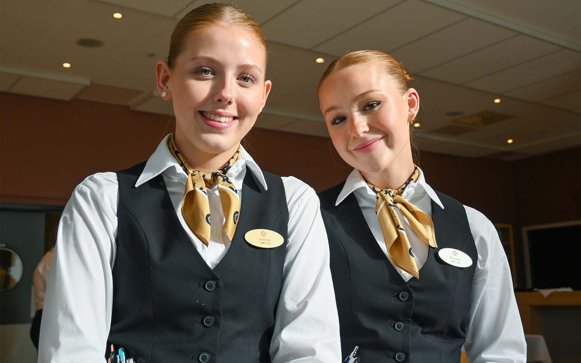 Color Line som hører til Vestfold hadde stilt sterkt opp og var lett gjenkjennelig på logo-tørklene i halsen. Disse vant 2. plassen for servitørlærlinger. 18-åringene Malene Raaum Ropstad og Emma Bauge Eckholdt har gått på samme skole i Kristiansand og jobber sammen på Color Line Fantasy.