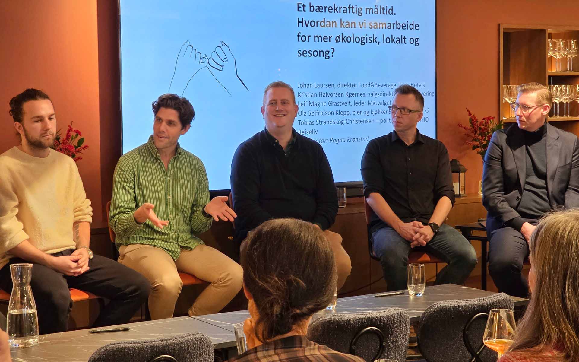 Under Debio Marked sitt markedsseminar mandag 10. november, i forkant av utdelingen av Matprisen, ble det avholdt en panelsamtale med temaet «Et bærekraftig måltid». Hvordan kan bransjen samarbeide for en større andel økologisk, lokalmat og sesongbaserte varer? Paneldeltakerne bestod av Johan Laursen, direktør Food&Beverage i Thon Hotels; Kristian Halvorsen Kjærnes, salgsdirektør i ASKO Servering; Leif Magne Grastveit, leder i Matvalget; Tobias Strandskog-Christensen, politisk rådgiver i NHO Reiseliv og Ola Solfridson Klepp, eier og kjøkkensjef på Restaurant K2.