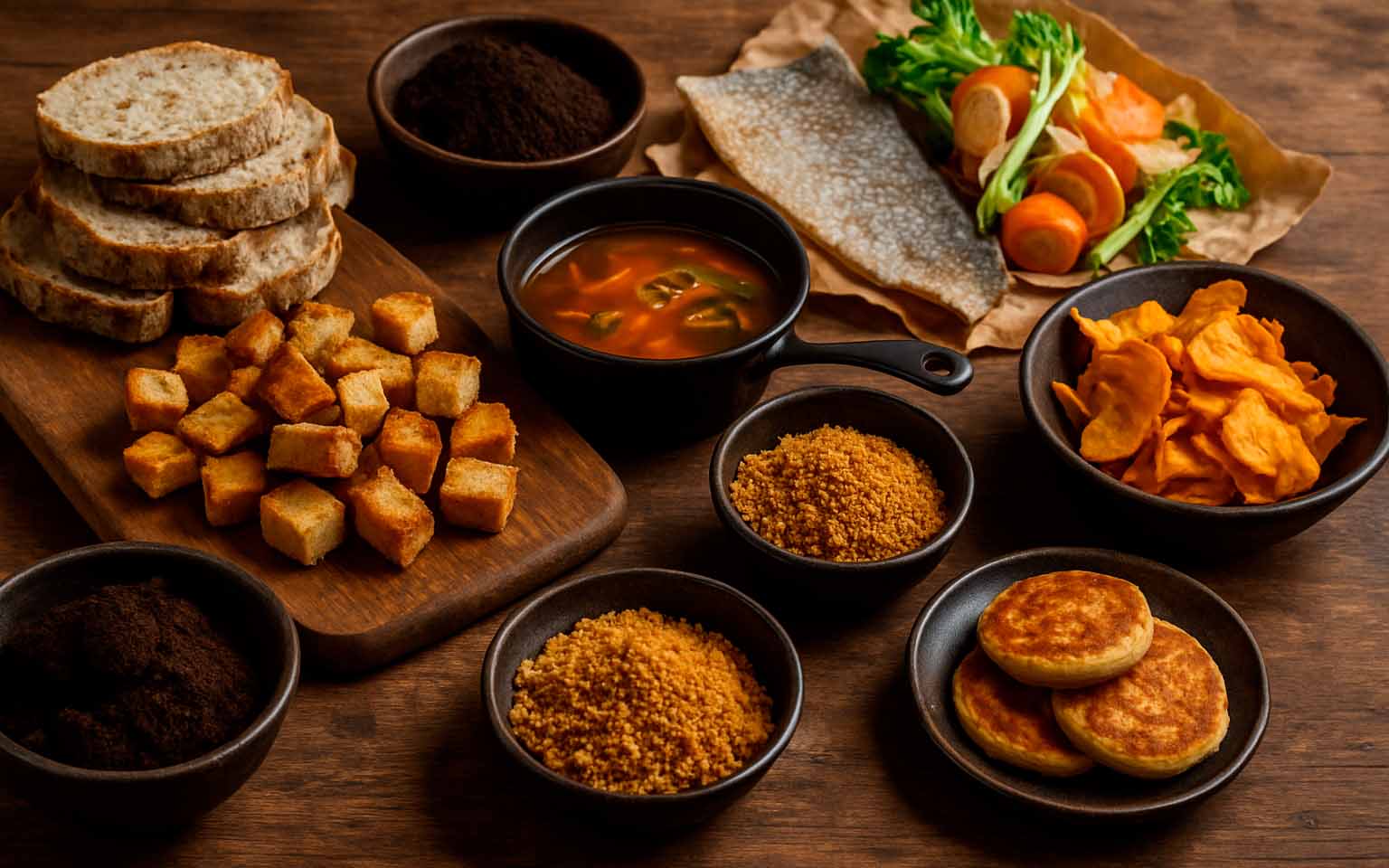 Brødrester blir til krutonger eller panering. Kaffegrut brukes som røykeelement. Grønnsakskutt og fiskeskinn går inn i kraft, chips og emulsjoner. Surdeigsrester får nytt liv som pannekaker eller fermentert snacks.
